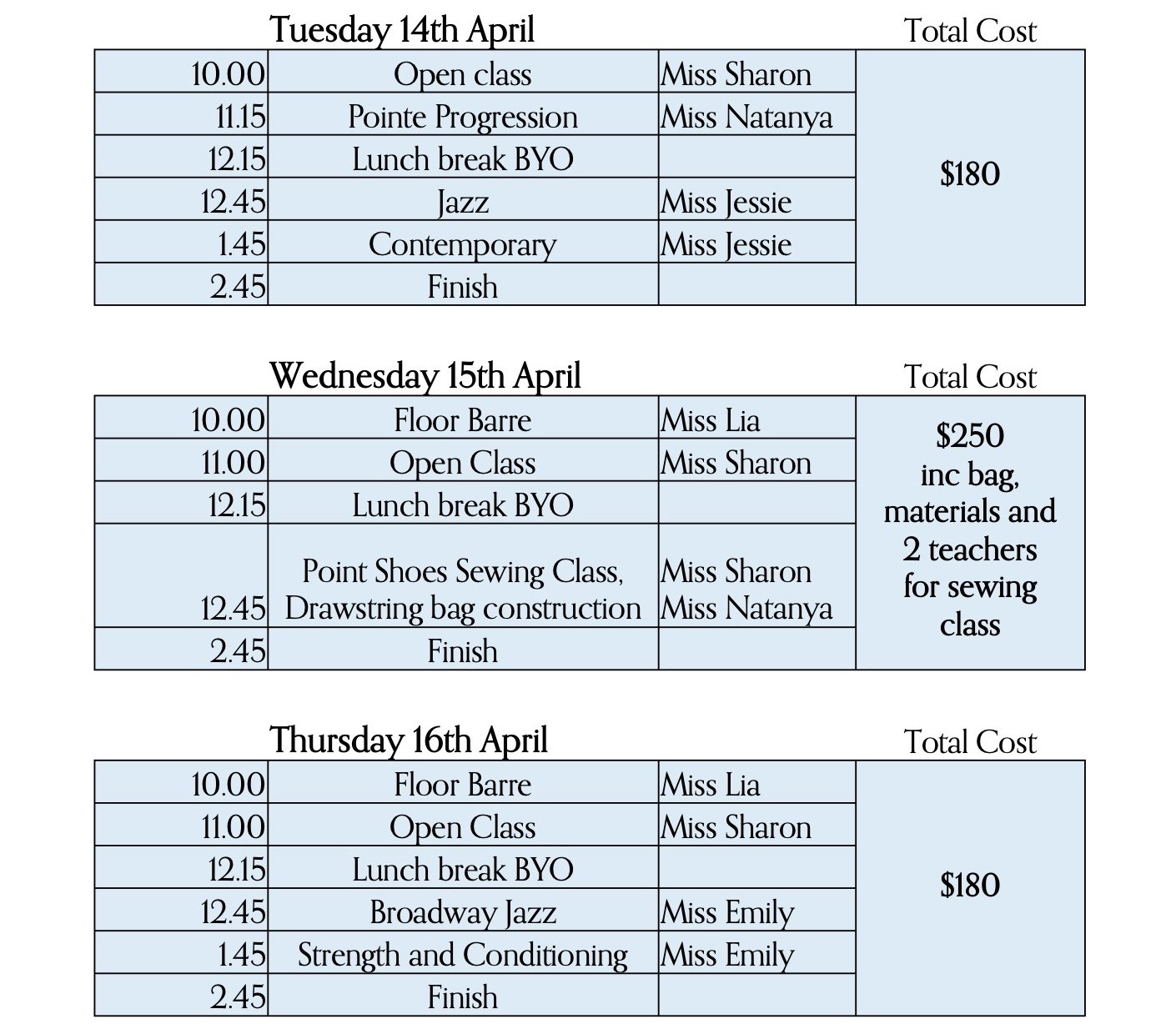 On the Wednesday will be a dedicated pointe shoe session where dancers will learn how to sew their own ribbons and elastics. They will then create a custom drawstring bag from scratch to hold their shoes. This hands on experience offers dancers a deeper understanding of their craft, building independence, care, and pride in their preparation. We hope this workshop delivers more than just classes, but a complete ballet experience.